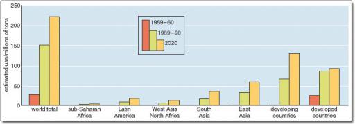 The major source of nitrogen compounds in the environment is now the increasing use of fertilisers to enhance crop yields, driven largely by the need to feed the large proportion of the world's human population that is undernourished. This is a trend that is expected to continue (Figure 10).