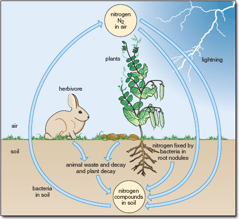 Nitrogen exists in the environment in huge quantities; as nitrogen gas (N2) it makes up 78% by volume of the Earth's atmosphere. As an element, nitrogen is an inert gas; that is, it is unreactive, is of little use to animals or plants and does no harm to them. It is when nitrogen becomes incorporated into compounds with other elements (notably oxygen or hydrogen) that it becomes reactive and can be harmful. In a natural environment, like that which existed before the industrial revolution, reactive compounds of nitrogen are produced naturally, in relatively small quantities. For example, lightning converts nitrogen in the atmosphere into compounds called nitrates that enter the soil in rain. Bacteria that occur in nodules on the roots of certain plants, known as nitrogen-fixing bacteria, also convert nitrogen gas into nitrogen compounds which enter the soil, providing a natural fertiliser.